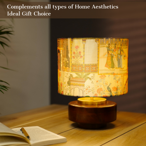Mango Wood Table Lamp, Yellow Victorian Fabric Shade - RIO Collection